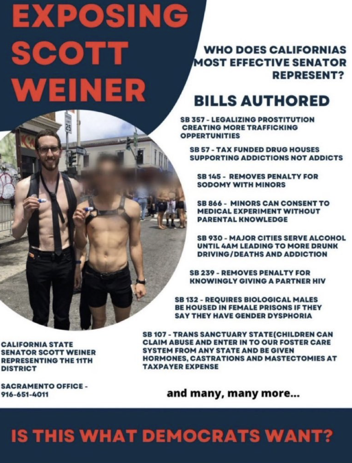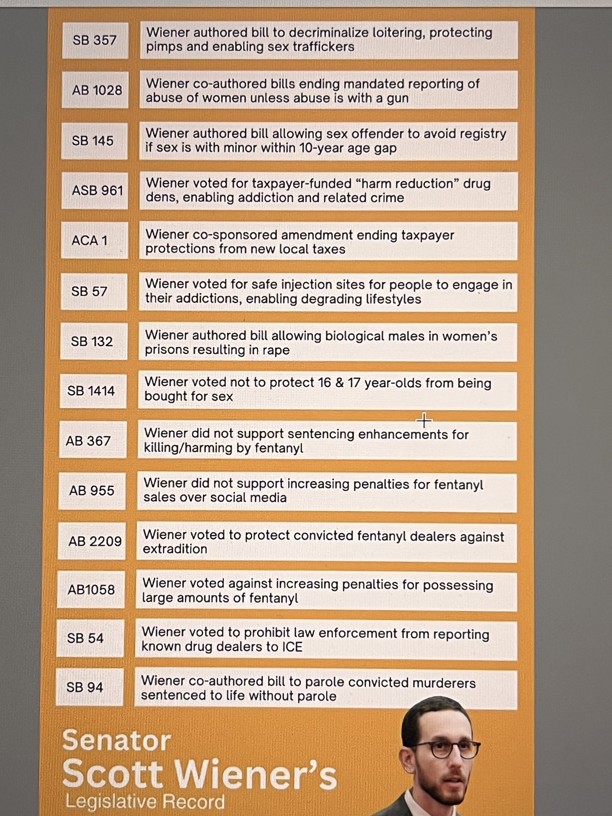 Wiener has advanced legislation that undermines parental rights, sexualizes children, and protects criminal offenders. His bills separate children from parents who oppose gender transitions, permit inappropriate adult–minor interactions, allow biological males undress in girls’ locker rooms and sports, and even place them in women’s prisons. He has weakened mandatory reporting and reduced penalties for sex offenders, drug dealers, and fentanyl traffickers—despite fentanyl being the leading cause of youth deaths.